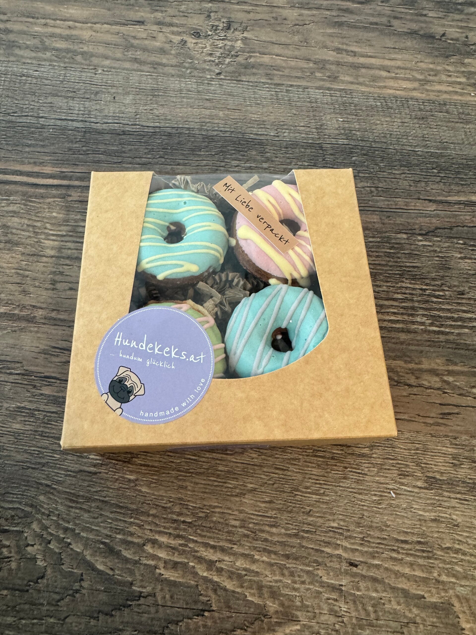4 Stück köstliche knusprige Donuts mit würzigem Käse überzogen mit Hundeschokolade. Die perfekte Belohnung wenn es mal etwas ausgefallenes sein darf