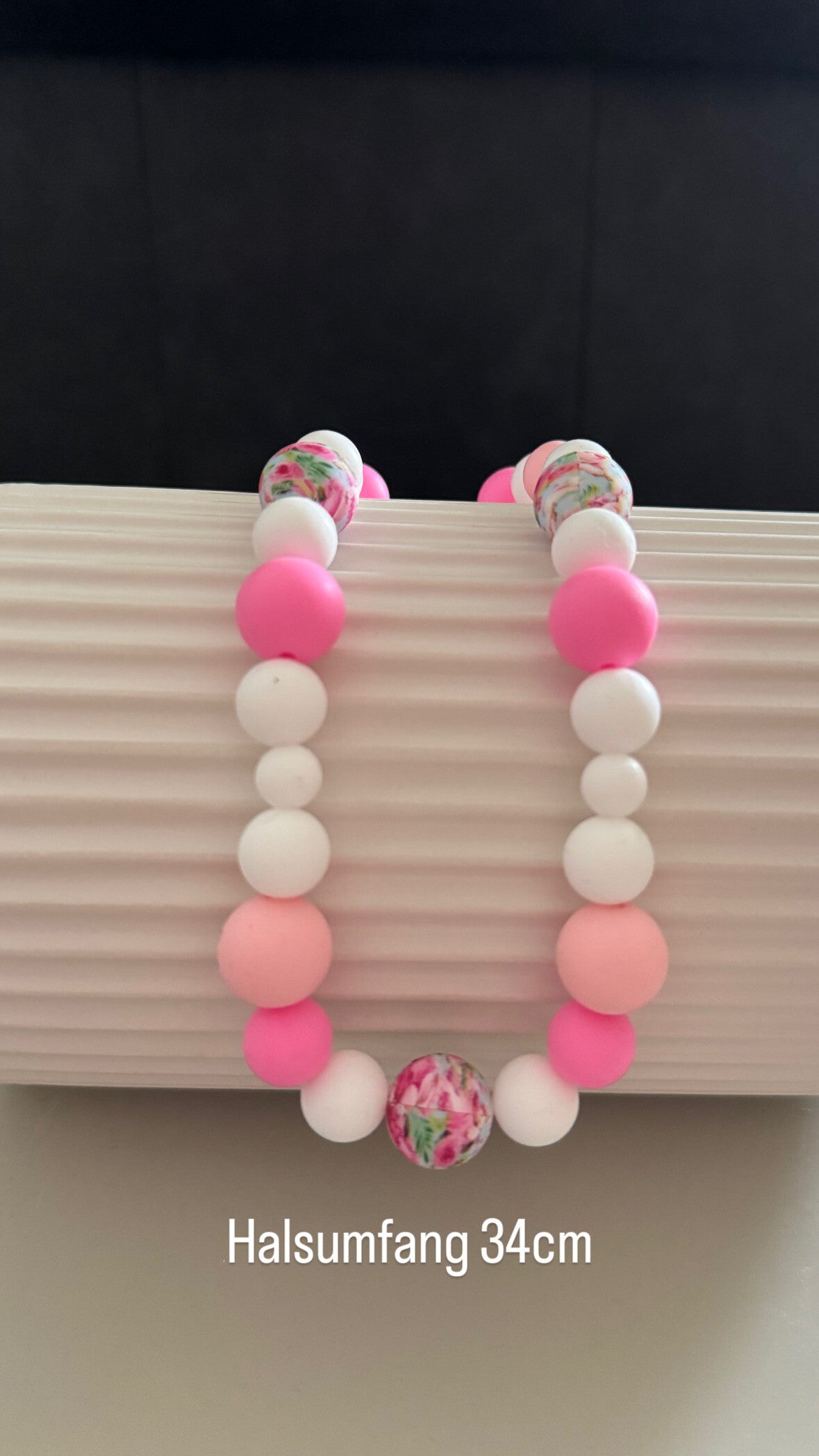 Bei dieser Perlenkette wurden 15mm, 12mm und 9mm große Silikonperlen verwendet.